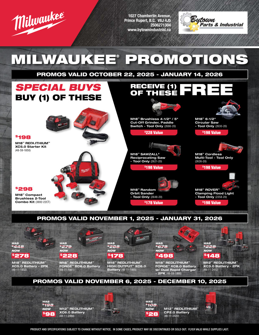 FREE WHEN YOU PURCHASE THE MX FUEL TOWER LIGHT (MXF0411XC)! Includes a 1/2 in. hammer drill, 1/4 in. impact driver, 1/2 in. mid-torque impact wrench, SAWZALL® reciprocating saw, 6-1/2 in. circular saw, 4-1/2 in. / 5 in. grinder and LED work light.